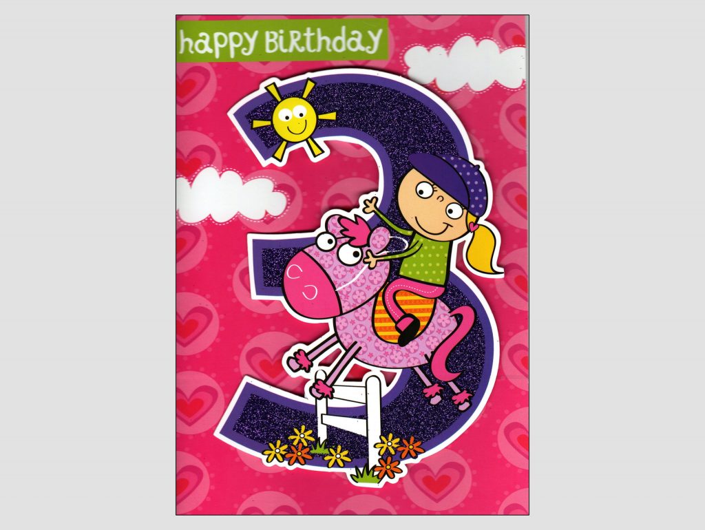 3rd Birthday Card for Girl. Female Riding Pony over a Stile. With Large Glitter 3D Number 3