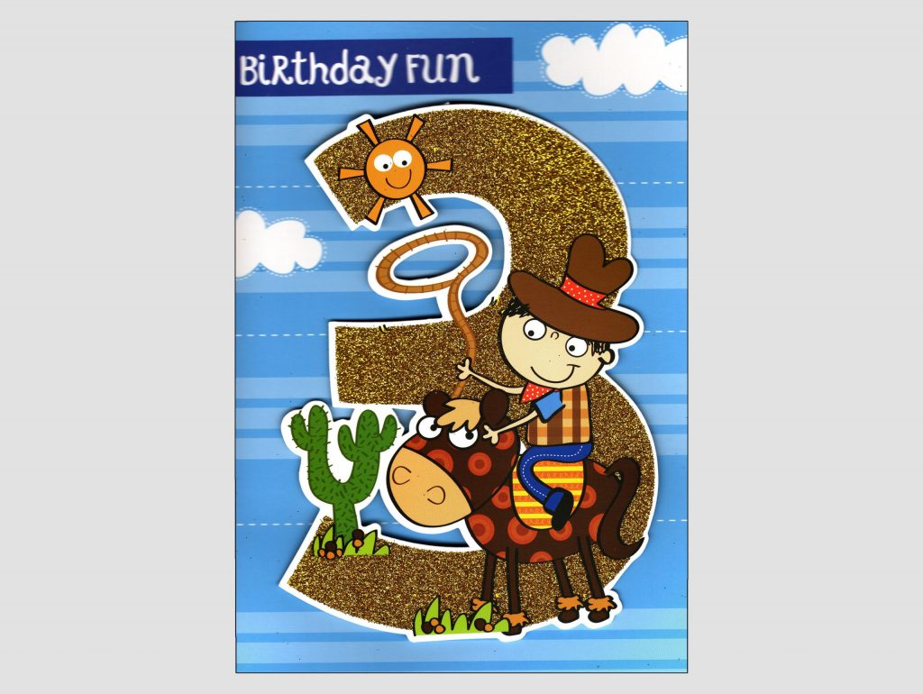 Birthday Card for 3 Year Old Boy – 3rd Birthday. Cowboy on Horse – Big 3D Glitter Effect number 3