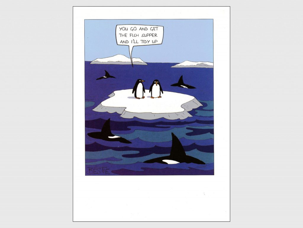 Funny Greeting Card Penguin Sharks – Blank Birthday Card or Any Occasions